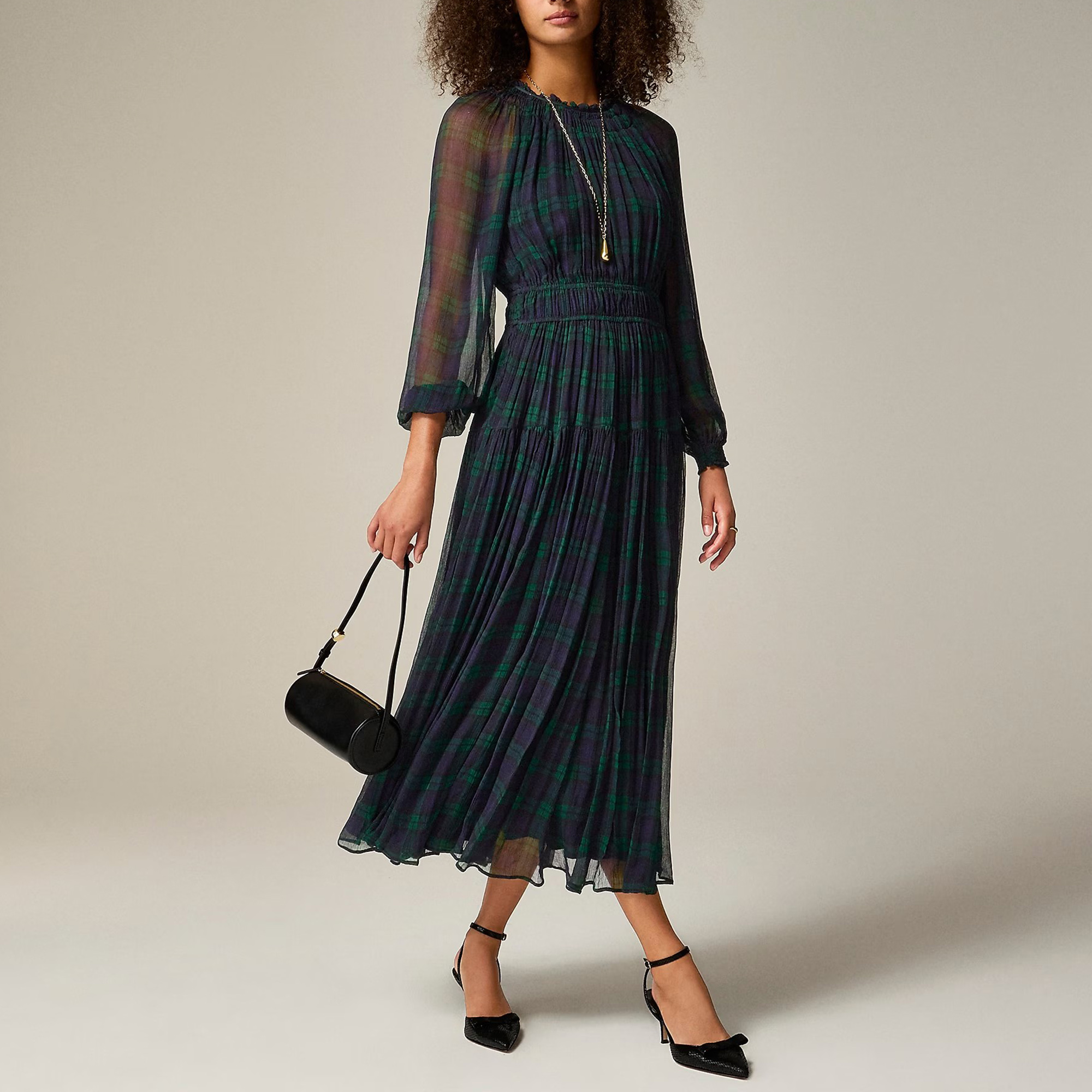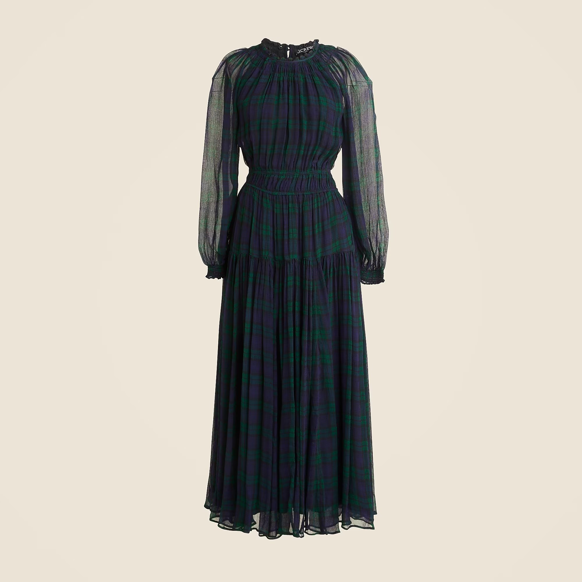 Crinkle chiffon sheer long-sleeve dress in Black Watch tartan