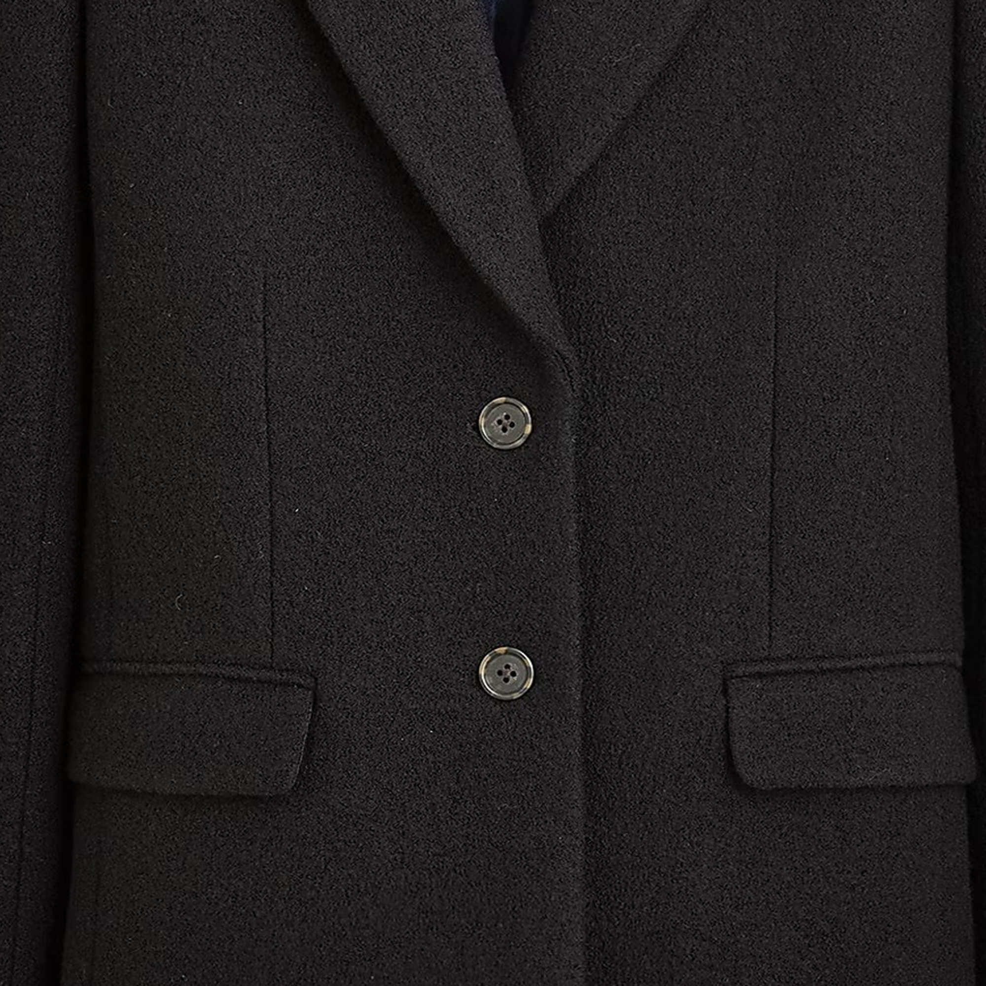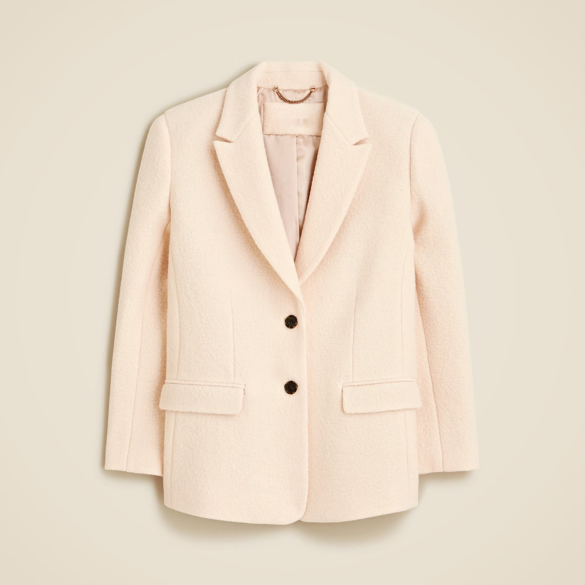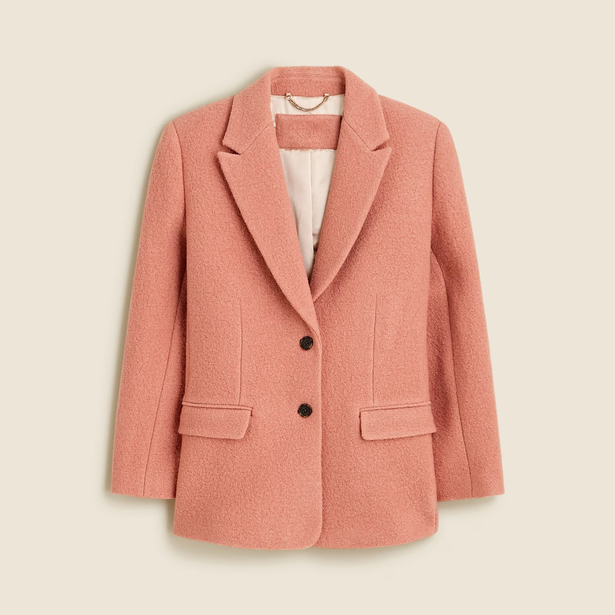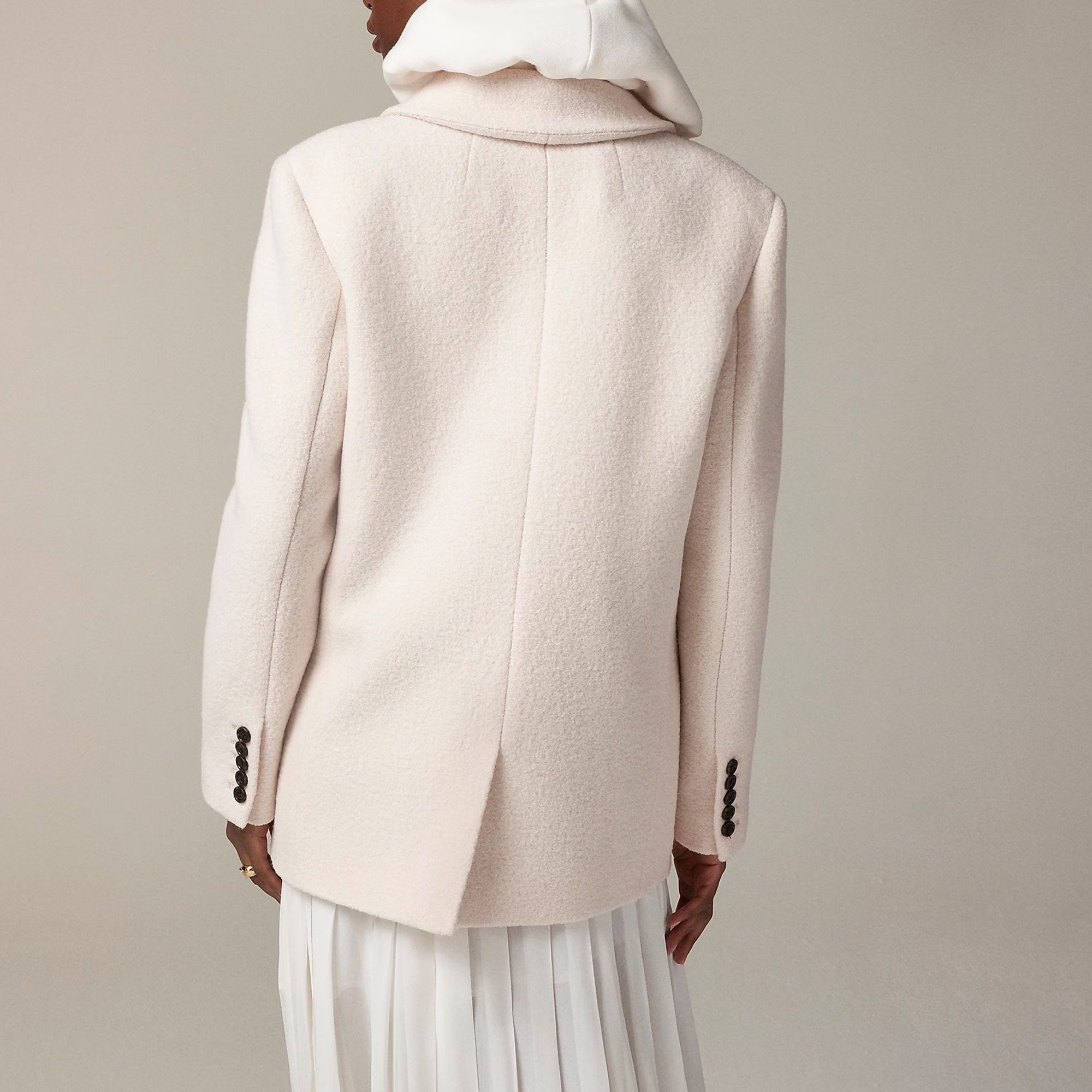 coat. . .Subtly oversized with a menswear-inspired fit, it's crafted from super-cozy boiled wool (translation: it's tightly woven for major warmth and less bulk). Plus, it comes with three pocket details, a two-button closure and hits just below the hips.
